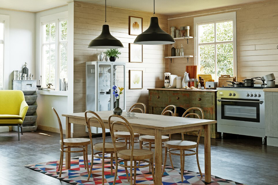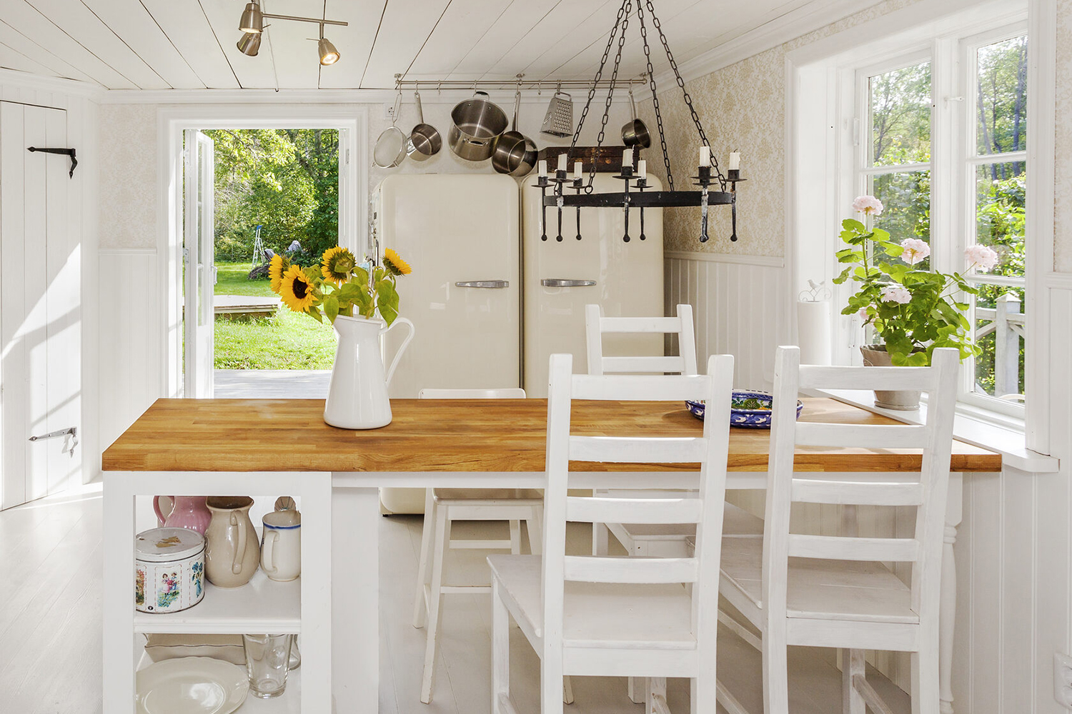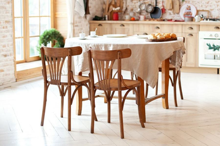 Обеденный стол имеет, как правило, прямоугольную форму, но встречаются также круглые, овальные и раздвижные. Мебель для кухни изготавливается из натуральных материалов, чтобы увеличить ее прочность и срок службы.