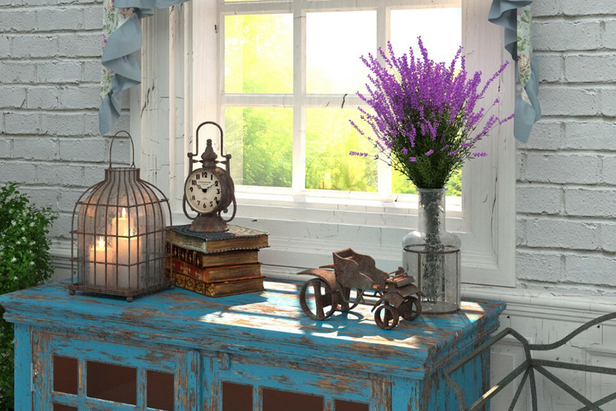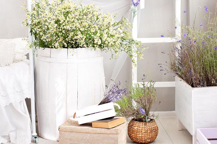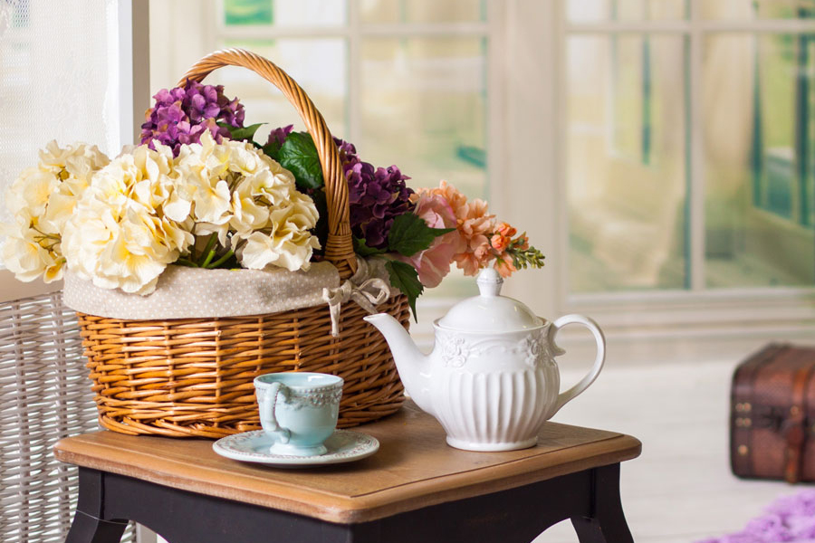 Живые цветы и разнообразные безделушки являются отличительной особенностью стиля. Цветы располагаются не только в горшках, но и в плетеных корзинках, шкатулках, чайниках, даже в старых ведрах и резиновых сапогах. Рядом на стеллажах расставляются фарфоровые статуэтки, вазочки, резные шкатулки и подсвечники. Их размещают на открытых полках и стеллажах.