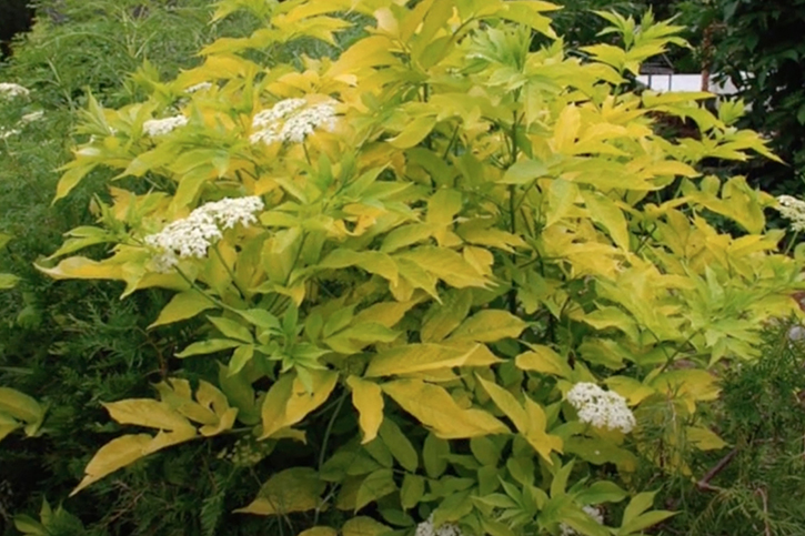 - Aurea – пожалуй, самый популярный сорт бузины черной в ландшафтном дизайне, ценится за пышную листву всех оттенков желтого, черешки бледно-розового цвета, морозостойкость до -29 °С;