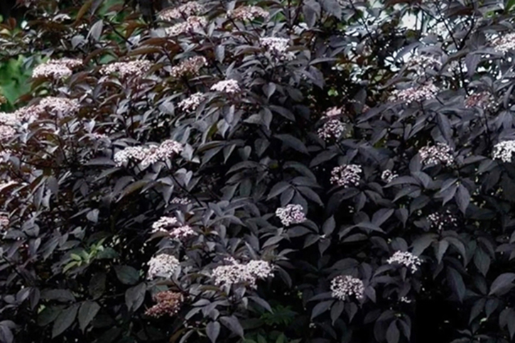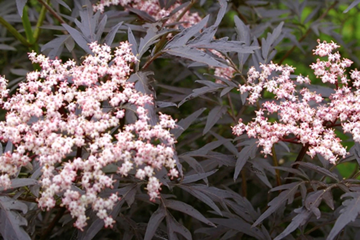 - Black Lace (Eva) – ажурной листвой напоминает японский клен, листья темно-пурпурные, цветки бледно-розовые, собраны в крупные соцветия, морозостойкость до -29°С;
