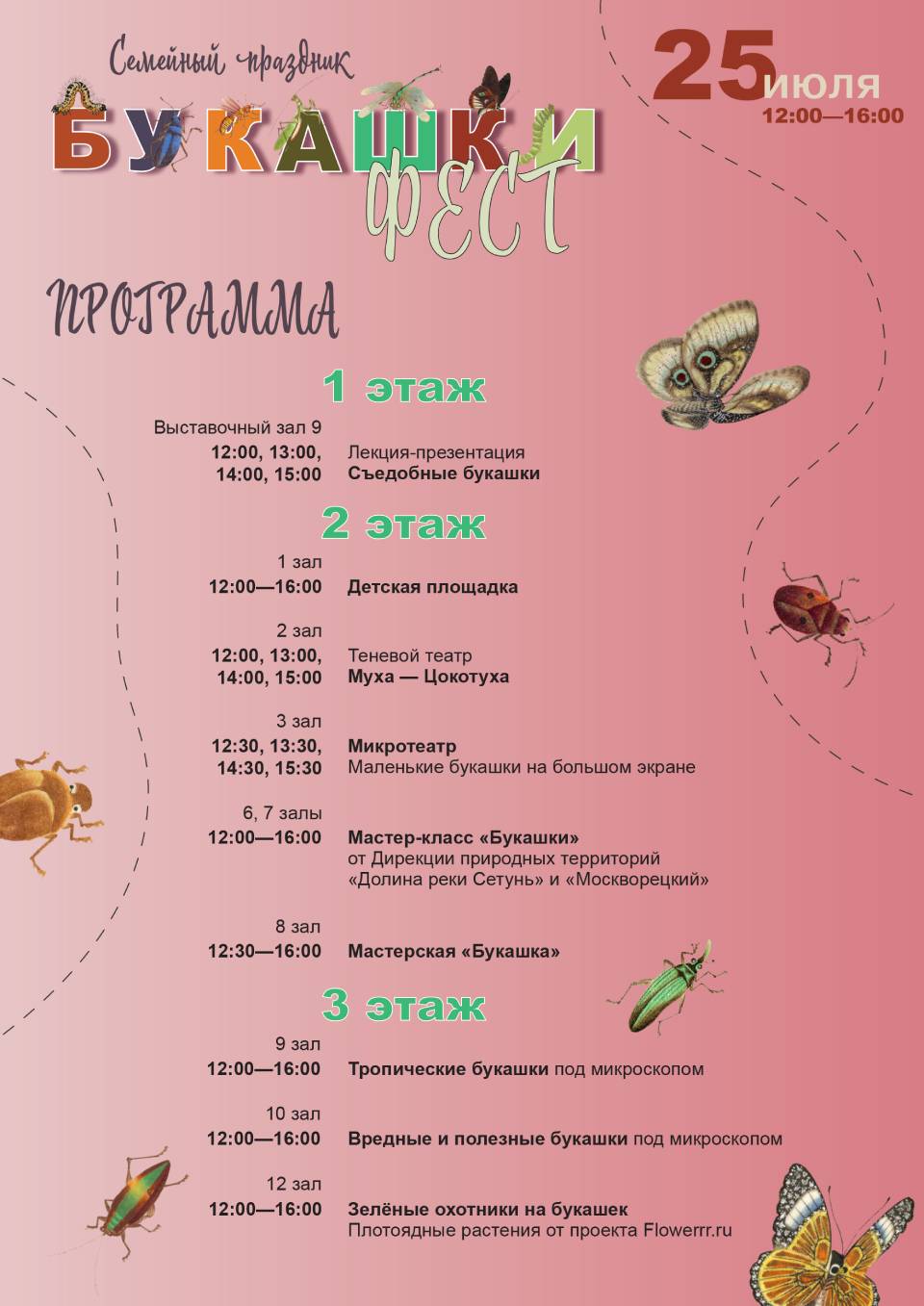 Гости увидят многих редких и необычных насекомых, среди которых мадагаскарские тараканы и экзотические членистоногие из частных коллекций. Кроме того, посетители узнают свой рост и вес в букашках, а также создадут «букашку» — украшение на руку.