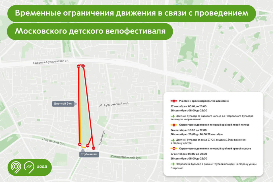 27 сентября с 00:01 до 20:00 и 28 сентября с 08:00 до 22:00 — движение будет полностью перекрыто в обоих направлениях на участке Цветного бульвара от Садового кольца до Петровского бульвара.