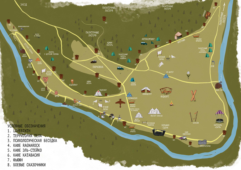 В большом и малом шатрах традиционно можно будет посетить лекции и мастер-классы. Огромное значение в этом году уделено апсайклингу. Среди других уникальных локаций фестиваля — Кинобар с новой концепцией и меню каждый год и Тятр — сцена, где можно побыть зрителем, заглянуть за кулисы или стать участником событий. «Психологическая» беседка предложит мастер-классы, тренинги, лекции и трансформационные игры от профессиональных психологов. «Территория тела» станет пространством для встречи с собой через йогу, цигун, танцевально-двигательные и другие телесные практики.