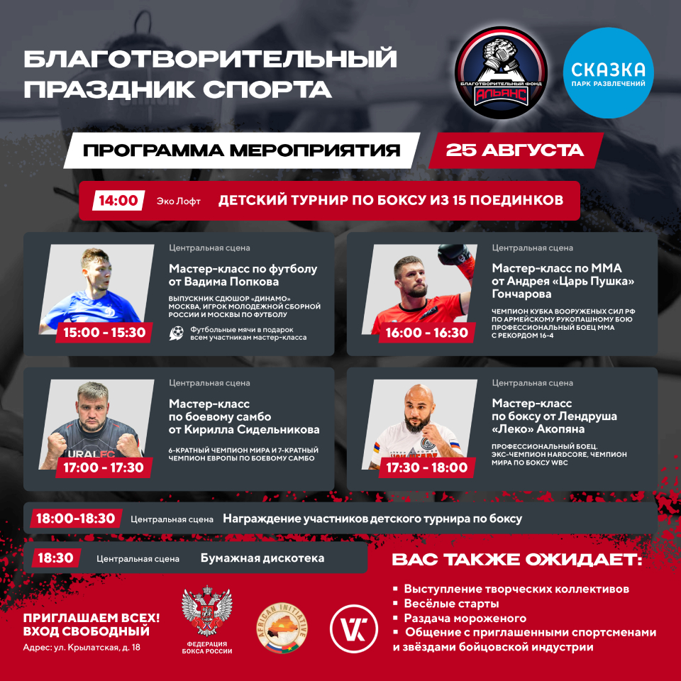 25 августа 2024 года в Москве пройдет фестиваль спорта. Известные спортсмены и звезды бойцовской индустрии проведут масштабный праздник в парке развлечений «Сказка». Начало в 14:00.
