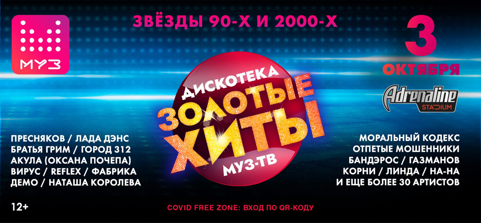 3 октября 2021 года в клубе в Adrenaline Stadium состоится грандиозная «Дискотека МУЗ-ТВ. Золотые хиты». Это незабываемое шоу специально для тех, кто хочет поностальгировать и вспомнить главные хиты 90-х и нулевых.