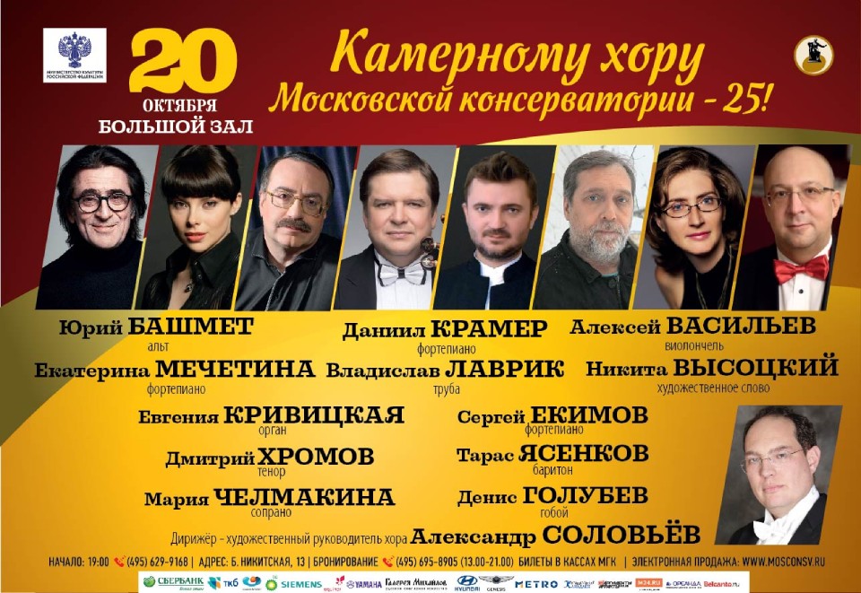 «Каждые пять лет мы делаем гала-концерт, который представляет самое лучшее и оригинальное из нашего репертуара, накопленного за текущую пятилетку, – рассказывает маэстро Соловьёв. – В этот раз с нами выступят альтист, народный артист СССР Юрий Башмет, актер, режиссер Никита Высоцкий, трубач, дирижер Владислав Лаврик, виолончелист, ректор Санкт-Петербургской консерватории Алексей Васильев, тенор, солист Геликон-опера» Дмитрий Хромов, с которыми в последние годы сложилась тесная дружба. Но будут и наши постоянные, многолетние сценические партнеры, такие как пианисты, заслуженные артисты России Даниил Крамер, Екатерина Мечетина, органистка, профессор Евгения Кривицкая, сопрано, лауреат международных конкурсов Мария Челмакина».
