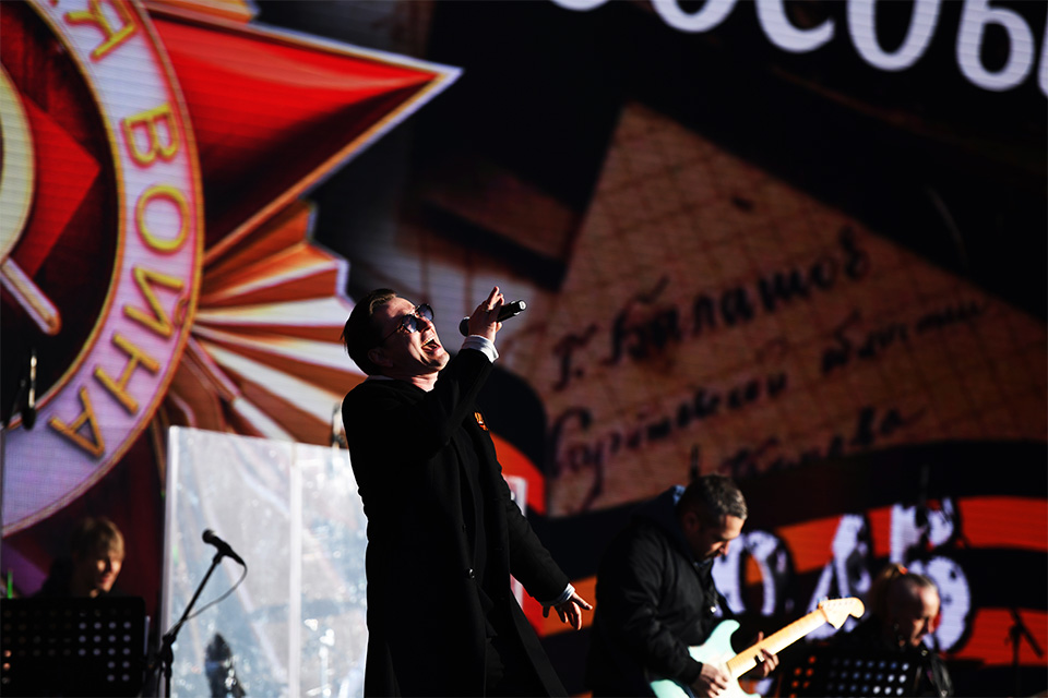 Вторая часть концерта пройдет с 17:00 до 18:00. В ней художественный руководитель МХАТ им. М. Горького и Московского Губернского театра Сергей Безруков представит музыкальную программу, включающую песни Владимира Высоцкого и другие произведения, посвященные Великой Отечественной войне. Также в этом блоке выступят артисты Московского Губернского театра и музыканты оркестра.