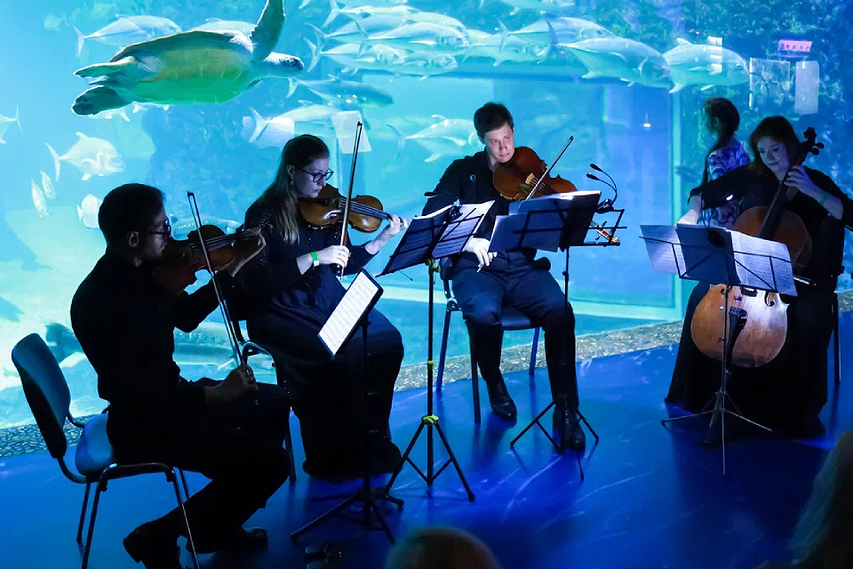 Выступление будет проходит в камерном пространстве, которое вмещает всего 40 зрителей. Атмосферы добавит мерцание воды и размеренная жизнь морских обитателей океанариума.