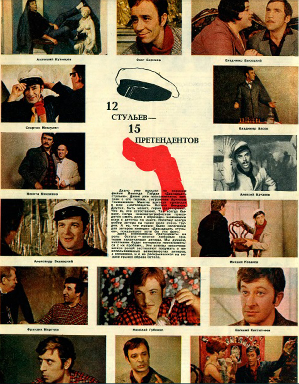 С Остапом Бендером все было еще сложнее. В 1972 году, уже после выхода картины, в «Советском экране» была опубликована заметка «12 стульев — 15 претендентов» с фотопробами разных актеров: Анатолий Кузнецов (будущий Сухов в «Белом солнце пустыни»), Спартак Мишулин, Олег Борисов, Владимир Высоцкий (!), Алексей Баталов (!!), Никита Михалков (!!! — это мог быть усатый Бендер), Александр Белявский, Фрунзик Мкртчян, Николай Губенко, Михаил Козаков, Александр Лазарев, Евгений Евстигнеев, Валентин Гафт, Владимир Басов, Андрей Миронов… Но на самом деле кандидатов у Гайдая было гораздо больше. Только «на кинопленку» пробовалось 23 актера, а фотопробы прошли чуть ли не 200 претендентов.
