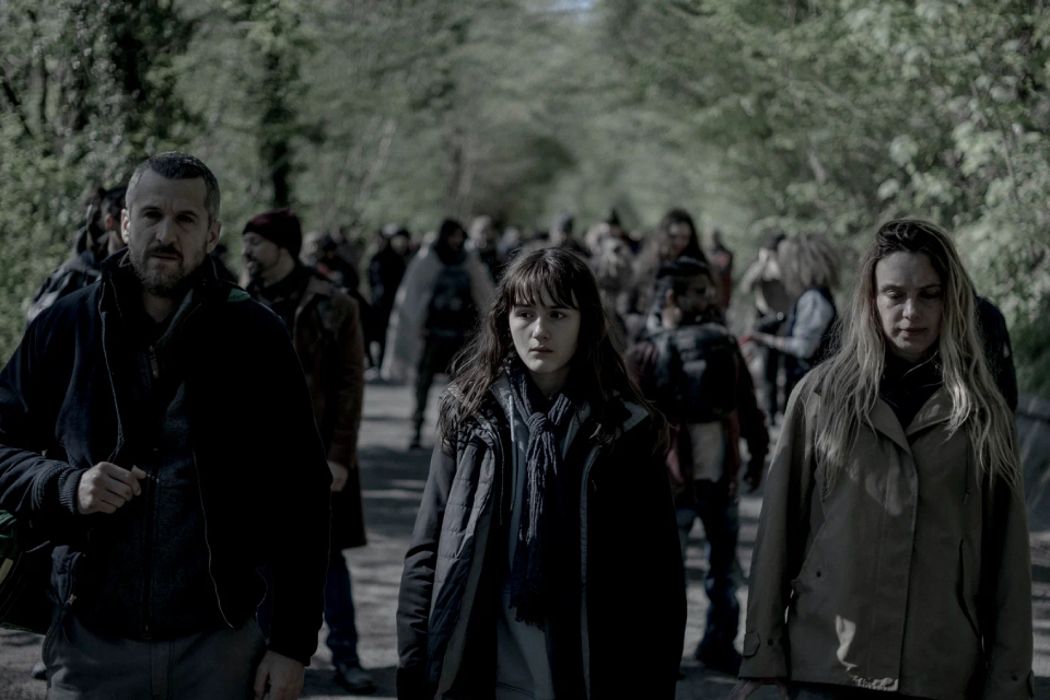 Эти дымящиеся капли — главный спецэффект в картине, снятой чрезвычайно экономно: даже обожженных людей нам показывают по минимуму. Дожди льют, герой с бывшей женой и дочкой едут в машине по дорогам сначала Франции, а потом Бельгии, жестоко отпихивая тех несчастных, которые, будто зомби, пытаются прорваться в автомобиль, оказываются в каком-то заброшенном помещении. Вода из крана отравлена, но в холодильнике, по счастью, хранятся запасы шампанского — им и утоляют жажду, хотя радости это не приносит: вместо того, чтобы веселиться, герои закатывают друг другу истерики. Дальше будет еще больше тоннелей, бункеров и особняков, в которых прячутся робкие выжившие. Дороги перекрыты, но это не важно: машина быстро ломается, приходится идти по дорогам пешком, с опаской поглядывая на небо. Продолжать путь в надежде найти родственника, который поможет и все решит (хотя от него уже могли остаться одни кости).