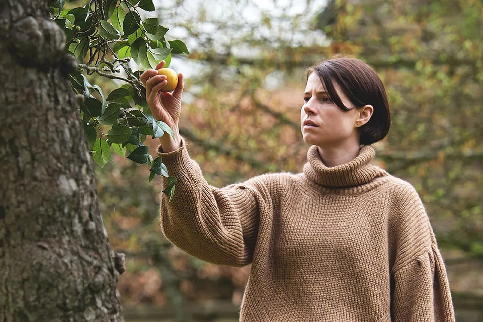 «Род мужской» – довольно близкий кинематографический родственник «Одержимости», и если Алекс Гарланд вдруг сообщит, что Жулавский – его любимый режиссер, в этом не будет ничего удивительного. Героиня – Харпер Марлоу, очаровательная женщина лет 30 (изумительная актриса Джесси Бакли, которую у нас лучше всего знают по роли княжны Марьи Болконской в британской «Войне и мире», и, может быть, еще по сериалу «Табу»), заявляет мужу, что им надо расстаться, и навсегда. Муж в квартире с видом на Темзу плачет, воет, говорит «Если ты уйдешь, я покончу с собой». Следует безобразная сцена: он ее бьет, она, придя в себя, спрашивает «Что это было?», а потом в ярости выталкивает его из квартиры с воплем «Мне плевать, будешь ты жить или умрешь!»