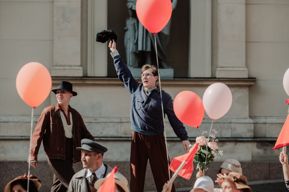 Один из дней съёмочная группа трудилась на Миллионной улице, которую на сутки перекрыли ради масштабной постановочной сцены — реконструкции Парада физкультурников 1930-х годов.