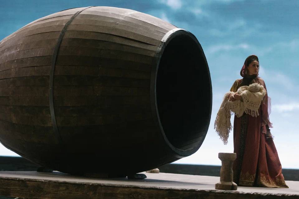 Когда Салтан уходит в военный поход, царица рожает ему сына. Злобные сестрицы пишут депешу царю, где врут, что его жена родила «и не сына и не дочь». Он расстраивается, но велит подождать его возвращения. Коварные девушки подменили письмо, и в результате молодую мать и наследника запечатали в бочку и бросили в океан.