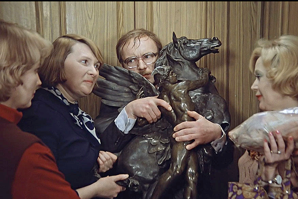 И продолжал: «На съемках Эльдар создал очаровательную атмосферу мнимой необязательности – снял с актеров тяжесть ответственности, балагуря, непрерывно остря. Актеры вслед за ним заряжались этой веселой энергией, непрерывно импровизировали, придумывали – Эльдар погрузил нас в атмосферу игры, напомнил простую истину: актер играет, а не занимается тяжелой работой. Репетировали прямо на площадке, изображение с кинокамеры шло на цветной монитор, мы, еще не зная твердо текст, с ролями в руках играли сцену, потом садились перед монитором и обсуждали увиденное; тут следовали властные указания от Эльдара, да и каждый из нас, поглядев на себя со стороны, делал соответствующие выводы… «Проще, легче, выше, веселее», – сказал Станиславский. Фрейндлих, Мягков, Ахеджакова, Щербаков, Немоляева, может быть, и я в какой-то степени воплощали этот лозунг на съемках».