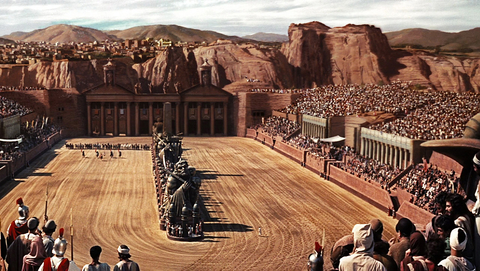 Самая масштабная сцена – гонки на колесницах. В разных источниках указываются разные данные об участниках массовки, но в любом случае все они впечатляют – 5, 8, 15 тысяч человек. Снимали сцену пять недель. С одной из колесниц связан интересный случай. В 1970 году новый владелец студии MGM распродал реквизит и костюмы из этого фильма. Покупатель из Сакраменто на аукционе заплатил 4 тысячи долларов за колесницу, участвовавшую в съемках. Через три года он был арестован за вождение этой колесницы на шоссе.
