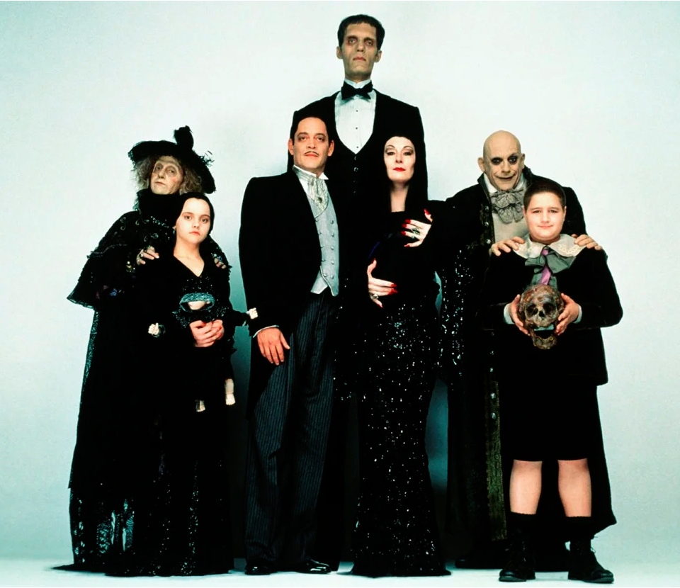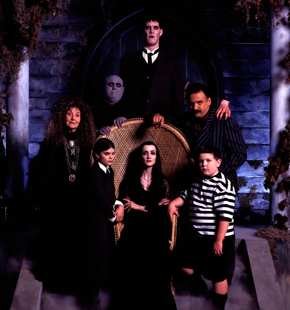 Семья Аддамсов богата и живет в мрачном готическом особняке. Гомес – глава семьи. Эксцентричный миллиардер испанского происхождения. Носит пышные усы, любит гимнастику и фехтование. Испытывает непреодолимую тягу к разрушению игрушечных поездов, это его «пунктик». Обожает свою жену Мортишу, которая внешне напоминает вампира: высокая, худая, с бледной кожей и всегда total black. Умеет накладывать порчи и произносить заклинания. Страстный садовод – выращивает в оранжерее ядовитые растения. Любит мужа не меньше, чем он ее.