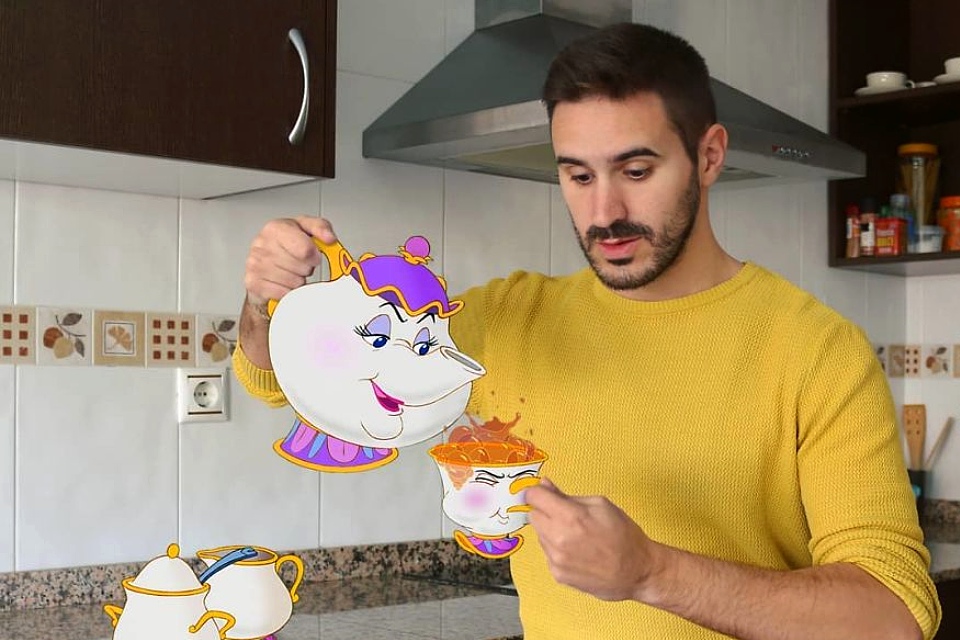 Если подойти к делу с фантазией, то и обычное чаепитие становится не таким скучным. Например, на этой фотографии испанец завтракает в компании очаровательного чайника из «Красавицы и чудовища».