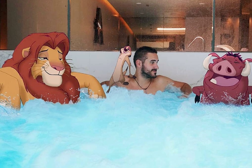 Тут испанец расслабляется в джакузи вместе в Симбой и Пумбой. Эх, всем бы такую компанию.