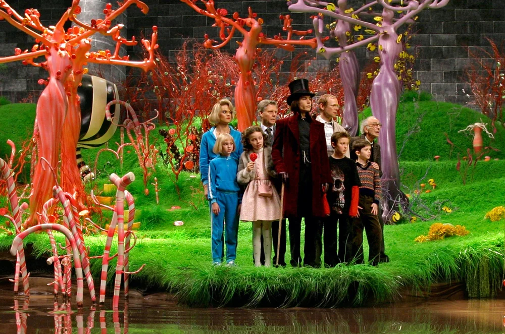 Интересный факт: Для съемок этого фильма компания Nestlé предоставила 1850 настоящих плиток шоколада, а еще и леденцы на деревьях, и гигантские сахарные трости, и мятные конфеты тоже были настоящими.