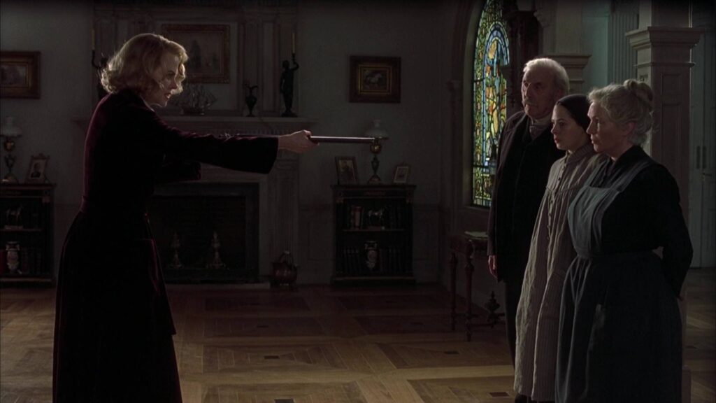 Сюжет: Грейс прячет своих детей — мальчика и девочку — в уединенном особняке на острове. Семья дожидается здесь окончания Второй мировой войны, с которой должен вернуться муж Грейс. У детей странная болезнь и они не выносят прямого дневного света. В доме появляются новые слуги, и им приходится строго соблюдать правила — всегда должен быть полумрак и нельзя открывать дверь, пока не заперта предыдущая. В эту размеренную и подчиненную правилам жизнь вдруг входит хаос.