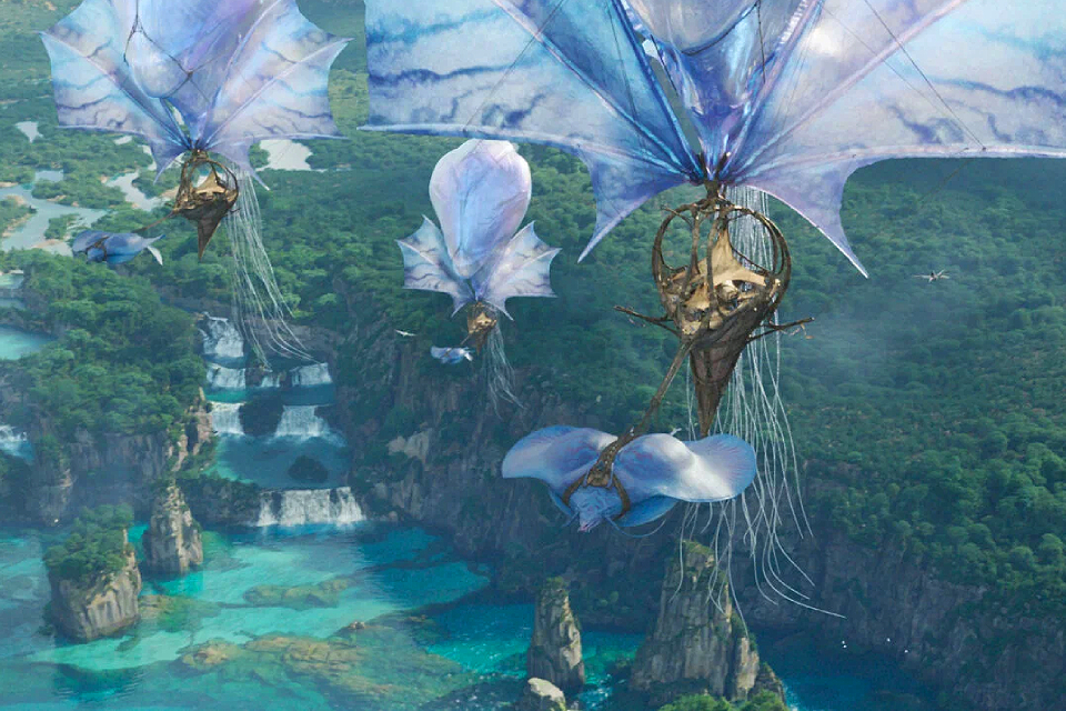 В третьей части фантазия Кэмерона идет по той же проторенной дорожке наименьшего сопротивления. Если среди на’ви есть племя воды, то пусть будет для разнообразия и племя огня, и если первое — хорошее, то второе будет не просто плохим, а отвратительным: сборище кровожадных дебилов под управлением дьяволицы. И не стоит мучиться, выдумывая каких-то принципиально новых пандорианских животных, не имеющих аналогов на Земле: вот плавает у нас в океанах такое существо, португальский военный кораблик, чуть-чуть его переделаем, сделаем гигантским и запустим в воздух, пущай полетает! (Воздушный флот пандорианских купцов, которых именуют «торговцами ветром», состоит именно из португальских военных корабликов, разобранных и по-хитрому собранных заново, но все равно узнаваемых с первого взгляда). А океаны Пандоры населены, ну ты подумай, кальмарами; прожорливыми, очень быстрыми, — но тупо кальмарами.