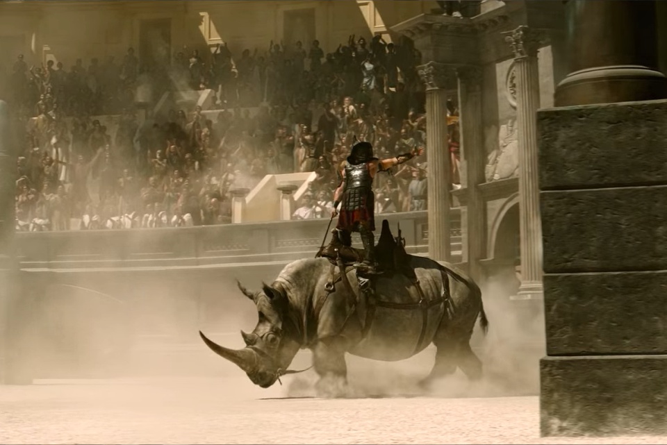 «Гладиатор II» — прямой наследник киновампук о Древнем Риме вроде «Клеопатры» (только совсем без романтической линии — чисто в плане роскоши, страстей и наплевательского отношения к истории). Но носороги бегают, бабуины скалятся, храмы, термы и цирки высвечены римским солнцем, кровь льется, песок мокнет. Безусловно, было бы дико обидно такое пропускать. Римляне бы за такое зрелище убили.