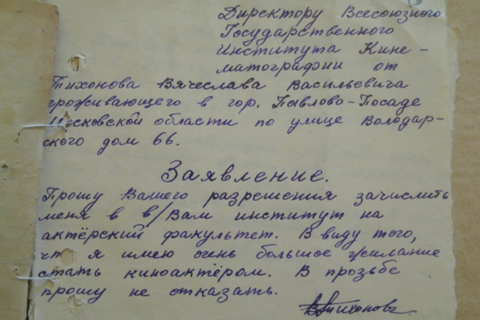 Родители, конечно, хотели, чтобы сын получил высшее образование, и считали, что лучше всего ему поступать в Сельскохозяйственную академию. Вопреки их желанию, он отнес документы во ВГИК. Сегодня невозможно поверить, но ему отказали со словами «Вы нефотогеничны». Он от отчаяния разрыдался прямо в институте. В этот момент мимо проходил актер Борис Бибиков, который во ВГИКе был преподавателем. Вид плачущего абитуриента его растрогал, и он решил зачислить его на свой курс на испытательный срок… (Впрочем, сам Тихонов в старости утверждал, что насчет слез все — легенда, настаивал, что на лестнице ВГИКа не рыдал. А Бибиков будто бы взял его потому, что после войны на актерском отделении был страшный дефицит юношей — поступали в основном девочки).