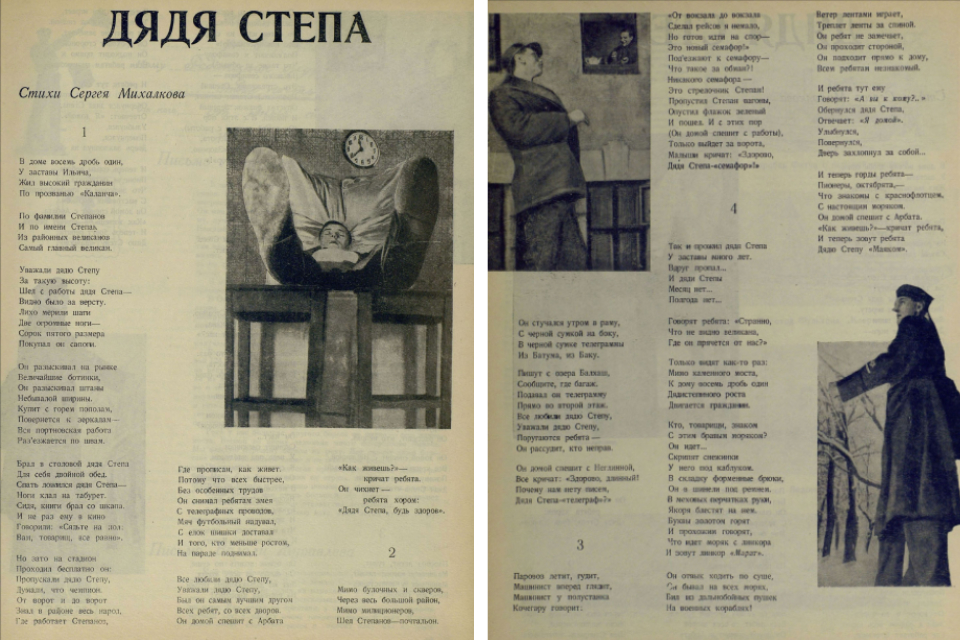 В то время там проходил конкурс пионерской песни Московского комитета комсомола, а будущий автор детской поэмы как раз увлекался написанием текстов для них. Вот только самым главным, что подарила эта поездка, стала идея создания книжки про дядю Стёпу. Пообщавшись с пионерами, Сергей Михалков понял, какого персонажа не хватает детям – настоящего героя, который жил бы с ними по соседству, рассказывал истории подвигов, а на досуге совершал бы их. И в том же, 1935 году, в седьмом номере журнала «Пионер» вместе со стишками о пионерлагерях была напечатана поэма о самом главном великане.