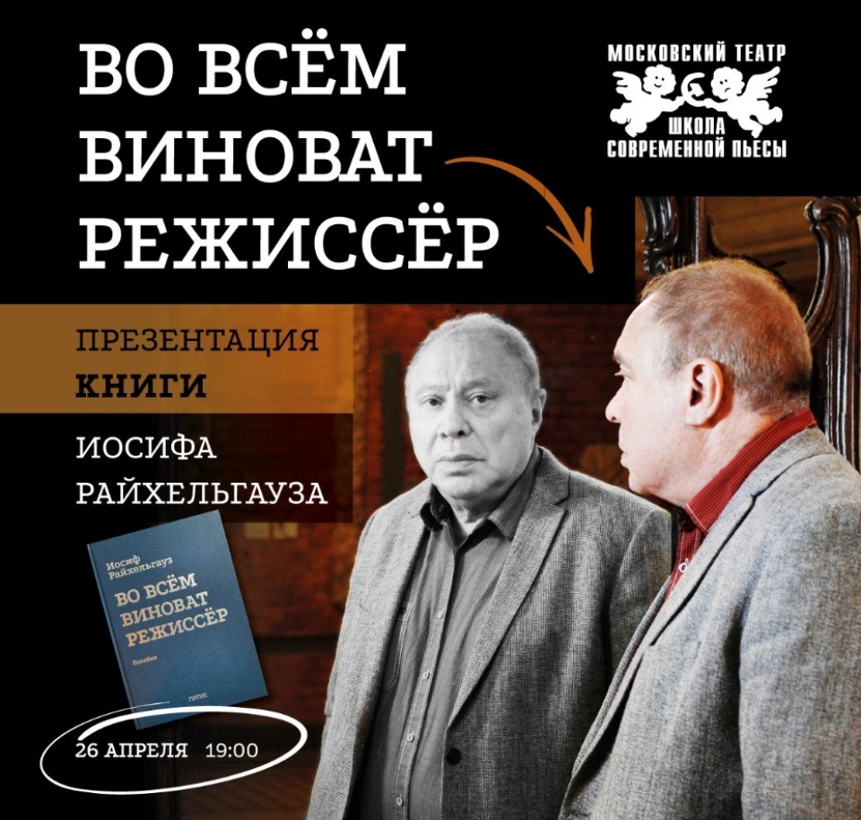 26 апреля 2022 года в театре «Школа современной пьесы» в Москве состоится презентация книги «Во всем виноват режиссер». Ее автор – Иосиф Райхельгауз, народный артист России, режиссер, худрук московского театра «Школа современной пьесы» и культовая фигура для российских театралов. Начало в 19.00.