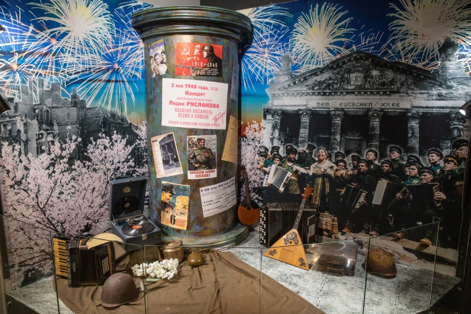 Выставка посвящена вкладу деятелей культуры в Великую Победу. Представлены более полусотни экспонатов — вещей композиторов, поэтов, артистов и художников. В центре выставки — инсталляция, основанная на памятном событии: первом выступлении советских артистов у стен поверженного Рейхстага, которое состоялось 2 мая 1945 года. Гости увидят подлинные музыкальные инструменты участников фронтовых бригад Великой Отечественной войны.