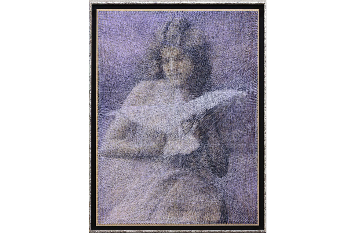 Аня и Андрей впервые увидели работы этим методом в черно-белом исполнении. И задумались: возможно ли создать цветную картину нитями? До них этого никто не делал. Математик и программист Андрей разработал специальный математический алгоритм нанесения рисунка и подготовил холст, набив гвозди. А затем Аня долгое время, слой за слоем, натягивала нити. В основу сюжетов, представленных на выставке, положены образы и истории из старых фотоальбомов 1910–20-х гг., найденных на на одном из европейских блошиных рынков.