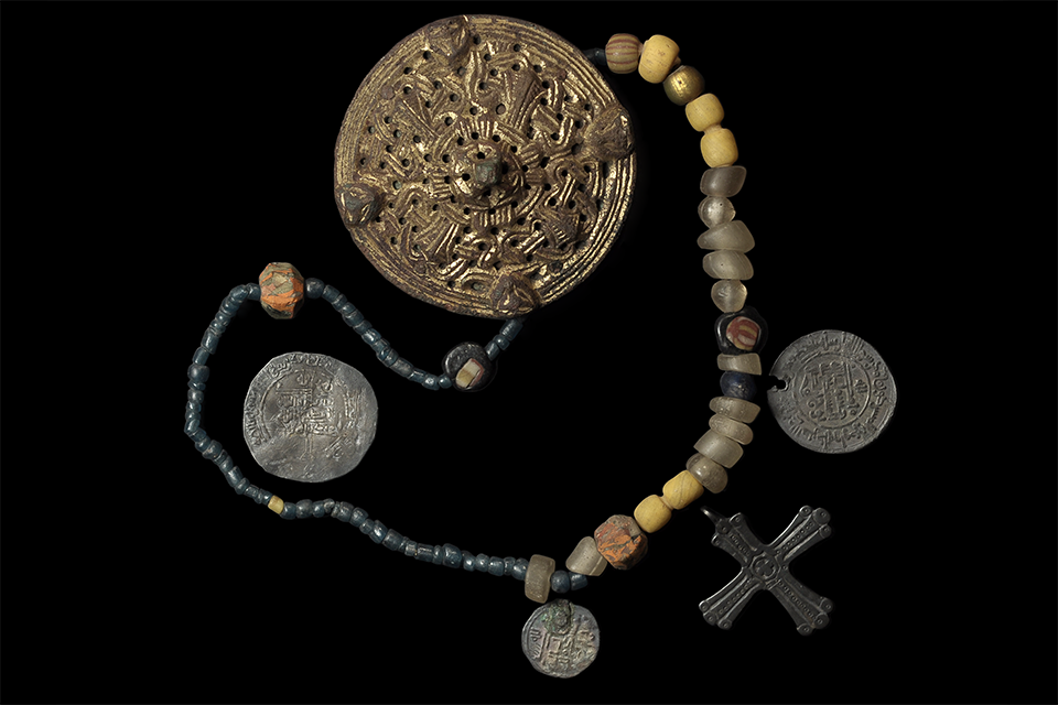Представлены 244 экспоната из фондовых отделов ГИМ: археологии, изобразительных материалов, письменных источников, древнерусской живописи, рукописей и старопечатных книг, драгоценных металлов, нумизматики, тканей, дерева, книжного.