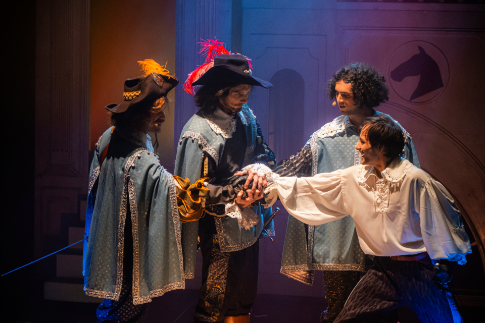 Театр «У Никитских ворот» представляет музыкальную версию романа Александра Дюма, объединяющую драматический спектакль и мюзикл. Постановка Марка Розовского делает акцент на живом исполнении: все вокальные партии звучат без фонограммы, а сценическое действие строится на пластике, танце и сценах исторического фехтования. Знакомый сюжет развивается динамично, сохраняя приключенческий ритм и атмосферу дружбы, соперничества и романтики.