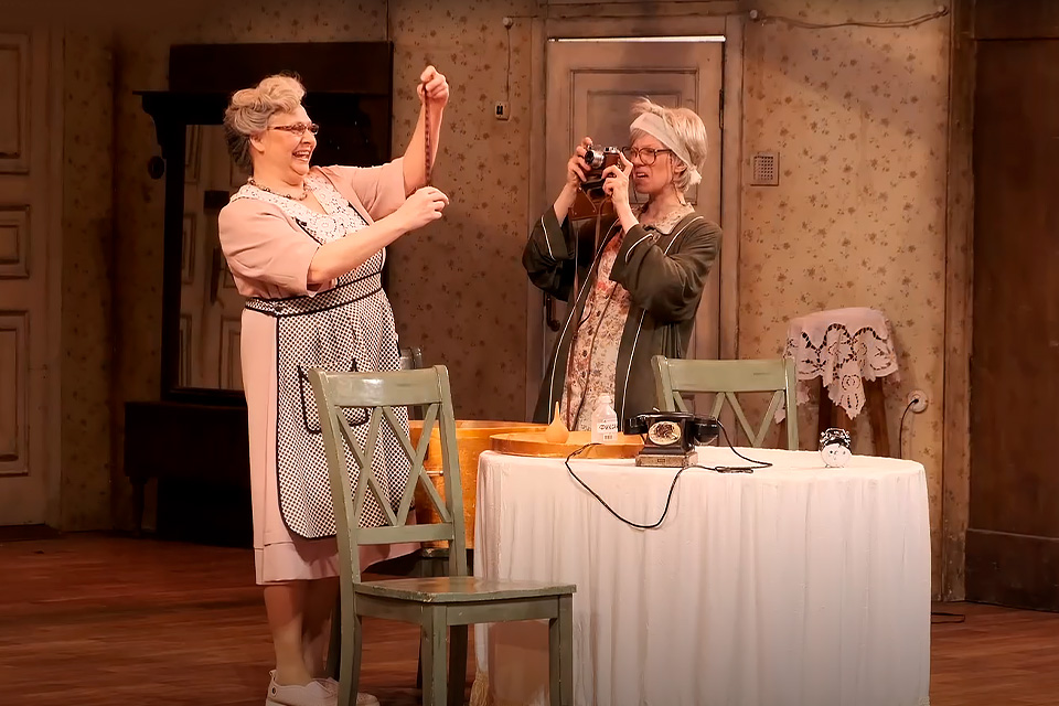 Сёстры Краузе пытаются сохранить привычный уклад, одновременно скрывая происходящее от окружающих. Постановка строится на актёрской игре и живых диалогах, где юмор соседствует с мелодраматическими поворотами. В спектакле заняты ведущие артисты труппы, включая Веру Алентову и Александра Арсентьева. Формат лёгкой вечерней комедии делает спектакль доступным для широкой аудитории.