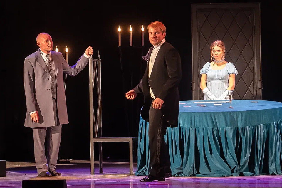 Постановка обласкана театральными премиями. В ней классический сюжет, традиционные костюмы, но интересный режиссерский «домысел». Ну или фантазия, если быть корректным. Нам приоткрывают завесу над тайной истории происхождения трех карт. Идея и сюжет произведения были подсказаны Пушкину князем Голицыным, который однажды отыгрался благодаря совету своей бабки. А той в свое время помог сам граф Сен-Жермен. В спектакле переплелись черты романтизма, мистики и реализма.