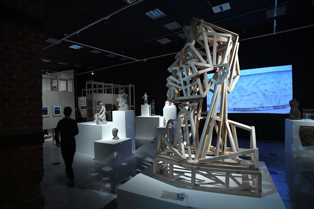 Странная «елка» Ильи Колесникова, выпускника Школы Родченко, созданная накануне нового 2021 года, иллюстрация выражения «мир перевернулся с ног на голову». Также и с другими экспонатами — что ни работа — то параллель и реминисценция. Также в экспозицию включено немало графических дневников, созданных в пандемию.