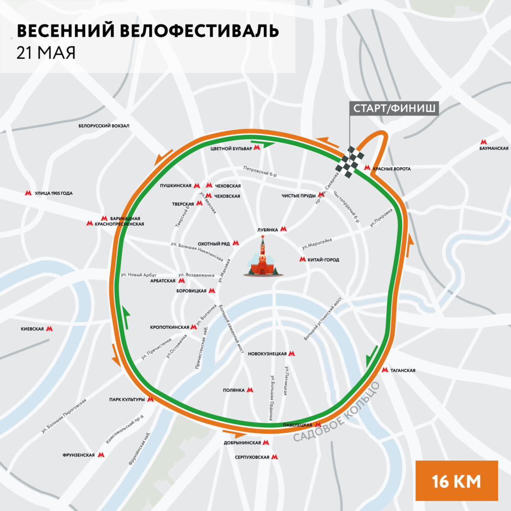 В 13.00 начнется главное — велосипедная прогулка по перекрытому от машин Садовому кольцу. Можно будет в полной мере насладиться катанием! Маршрут велопробега пройдет по Садовому кольцу и составит 16 км. В фестивальном городке, все развлечения и активности будут продолжаться до 16.00. Так что после прогулки можно вернуться и вновь принять участие в веселье.