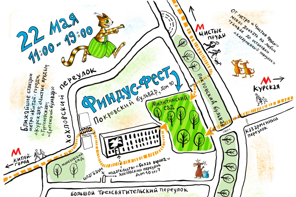 С 11.00 до 19.00 пройдет книжная ярмарка. С 13.00 до 18.00 запланированы различные мастер-классы. В 12.00 начнется спектакль «Охота на лис» театра «Домик Фанни Белл» по мотивам историй о Петсоне и Финдусе. В 13.00 всех желающих приглашают пройти книжный квест. А после посмотреть фильма «Петсон и Финдус. Маленький мучитель – большая дружба» (в шоу-руме: Хохловский пер., 10с7, сеансы в 14.00 и в 17.00). В 16.00 запланирован второй сеанс книжного квеста