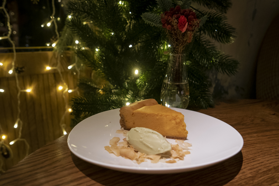 В поисках десерта снова заглянем в спецпредложение. Там очень классный чизкейк из батата с мороженым из авокадо и кокосовыми чипсами (420). Чизкейк-то он чизкейк, но весь такой легкий и праздничный. Берите без опаски. Да и вообще обстановка вовсю предновогодняя, огоньки мигают, девушки за соседними столиками улыбаются. Хорошо…