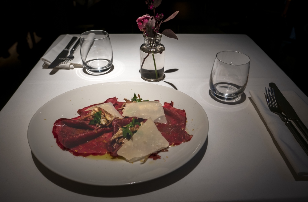 Еще про Италию. Карпаччо с артишоками и пармезаном (750) берите обязательно, хотя казалось бы — ну что мы не знаем о карпаччо? Чем тут можно удивить? А вот поди ж ты. И дело не в сыре и не в артишоках — их тут ровно столько, чтобы не отвлекать внимание от главного: говядины. Она не просто тонко нарезана, впечатление такое, что каждый кусочек подвергся расслабляющему массажу, от чего стал мягок и податлив. И это умиротворенное настроение передается едоку.