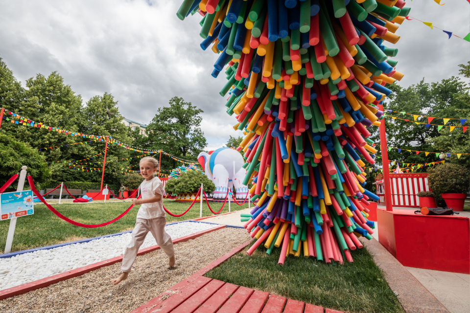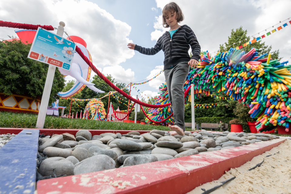 Найти тропу можно на бульваре напротив цирка Никулина. Сразу «лайк» декораторам: зона оформлена причудливыми арками, надувными слонами и флажками — как в мультяшном цирке. На часах десять утра, будний день, а народ уже рвется проверить себя.