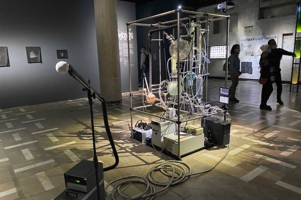 Следующее, на что стоит обратить внимание — биотехнологическая инсталляция POEM Томаса Фойерштайна. Она стоит прямо в центре зала, поэтому вам вряд ли удастся пройти мимо. Тем более что выглядит работа очень впечатляюще.