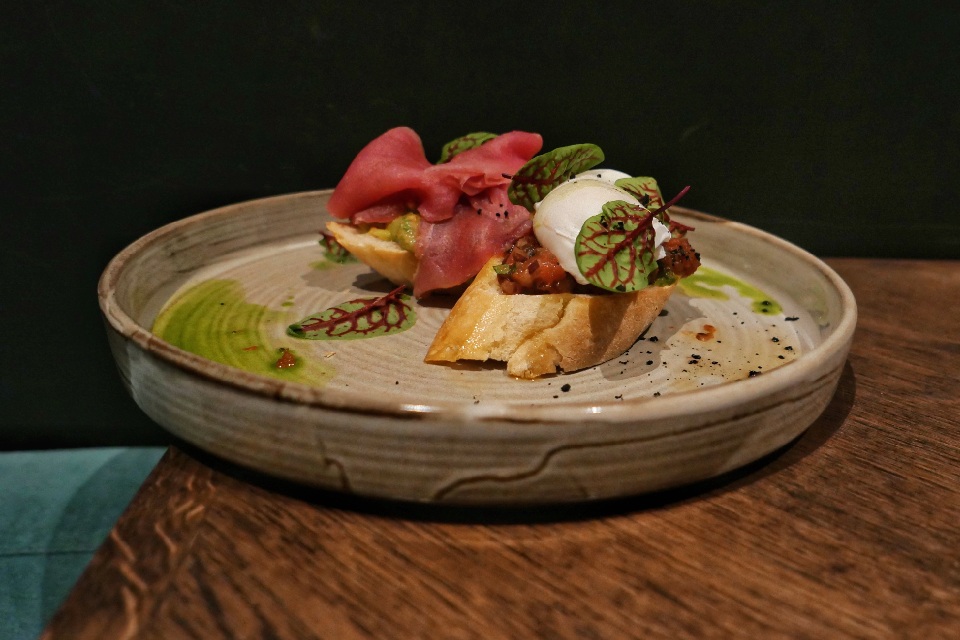 Про необистро Trip уже с улицы многое понятно. Взрослое серьезное заведение не станет писать на стене «Очередное модное место». Тут явно молодым задором пахнет. И приятной самоиронией. Внутри тоже все молодежно (кроме музыки – непрерывный ностальгический микс хитов диско/фанка из 80-х, но он тут в тему). В центре — роскошный высокий стол на веселую компанию, покрытый плиткой. Свет точечный, приятный. И вообще все тут – дело рук молодых. Три приятеля: Андрей (управляющий), Григорий (шеф-повар) и Игорь (инвестор) переехали в Калининград из Питера (точнее, инвестор вернулся в свой родной город). Куча идей, много задора и никаких ограничений по части стиля еды: Россия, Испания, Азия, Италия. Похвальное, но не фанатичное следование новейшим гастрономическим тенденциям.