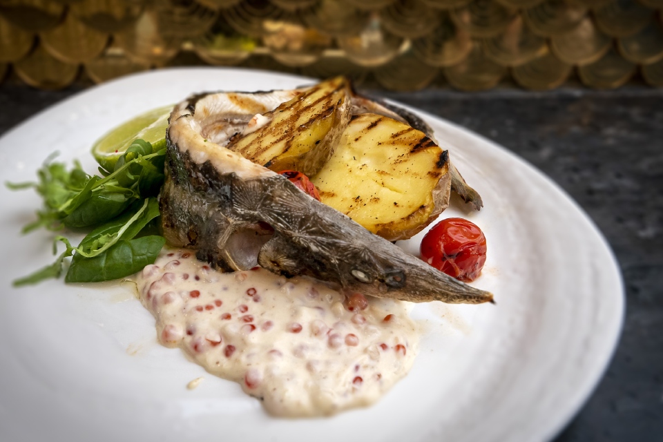 А как вам, к примеру, половинка стерляди (еще и соус с красной икрой — для усиления эффекта)? Также по разряду рыбы — fish & chips: исключительно правильная треска в темпуре и тончайшие картофельные чипсы.