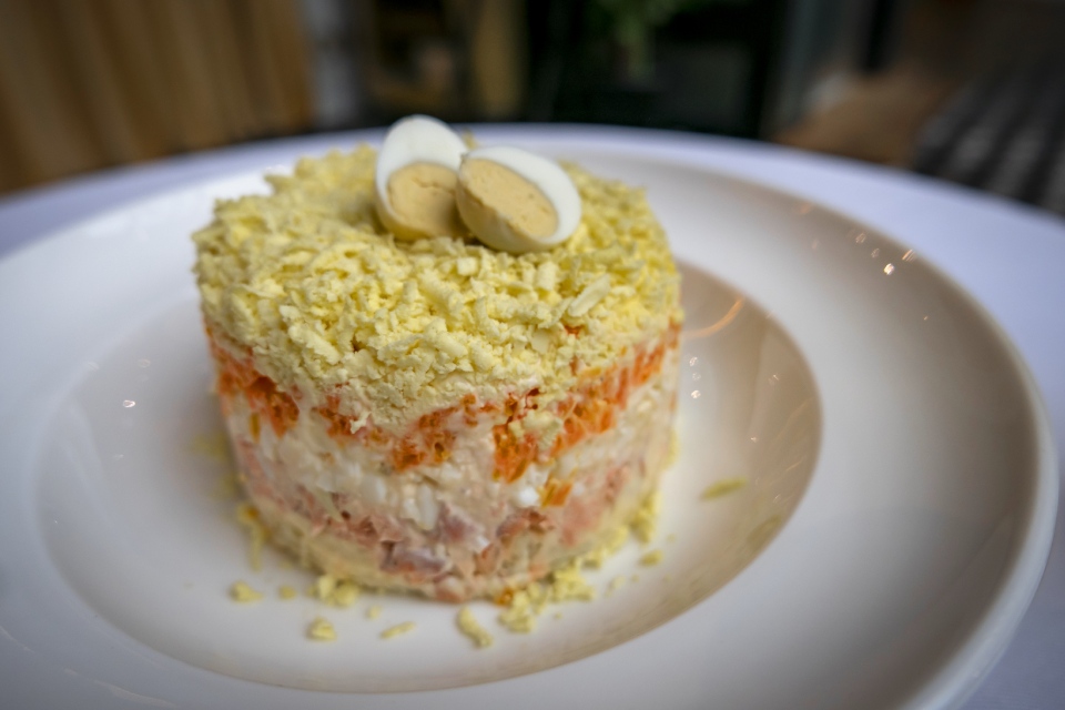 Первая мысль: маленькие порции стоят маленьких денег. Но вот приносят мимозу — порция вполне себе солидная. Зеленый салат с лаймовым соусом и половинкой авокадо — тоже, прямо скажем, не два листика. Салат с кальмаром и каракатицей, цезарь, сациви — все примерно в тех же объемах.