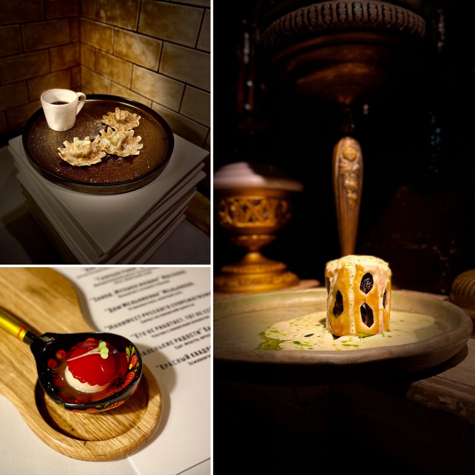 Музыкальный авангард представлен Александром Мосоловым и его новаторским произведением «Завод. Музыка машин», поэтому грибные пельмени в виде шестеренок. Авангард архитектурный — «Дом Мельникова», приготовленный из угольной рыбы. «Манифест русского супрематизма» — сорбет из квашеной капусты, вполне супрематично и очень по-русски.