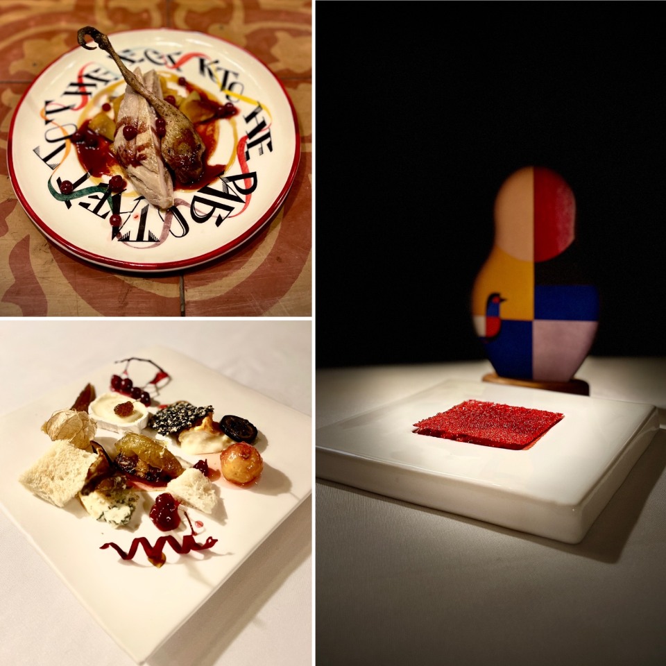 На тарелке с надписью «Кто не работает, тот не есть» (точная копия одного из главных образцов агитационного фарфора, был такой жанр в 20-х годах прошлого века), конечно, моченый ананас и рябчик. Для усиления антибуржуйского эффекта еще и фуа-гра. «Маленькие радости» Кандинского — совсем не маленькая сырная тарелка с цукатами, а «Красный квадрат» Малевича (да, был у него еще и красный) — земляничный десерт с хрусткой корочкой.