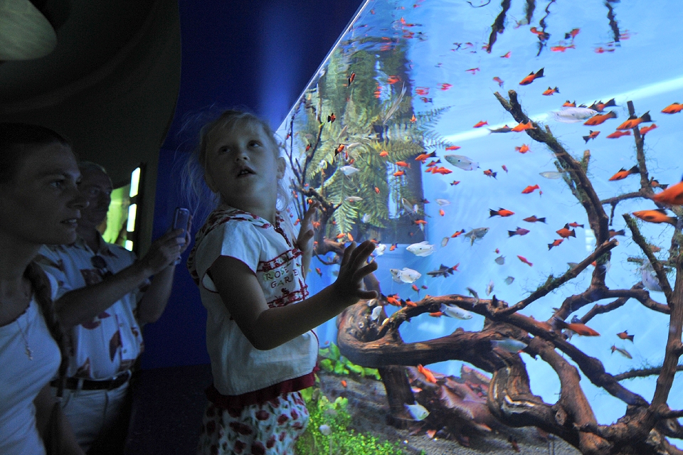 в 80 аквариумах — редкие виды осетровых рыб, занесенные в Красную книгу России, дельфины, огромные черепахи, редкие гавиаловые крокодилы, песчаная тигровая акула и пираньи. Рядом прячутся в рифах ядовитая рыба-камень, рыба-бабочка, рыба-клоун и еще десятки разных видов