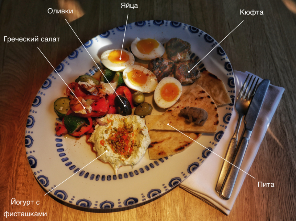Будучи фанатом английских завтраков, не мог пройти мимо сообщения о том, что в The Greeks запустили Большой греческий завтрак. Пришел, уселся и начал искать аналогии. А они есть. У англичан тосты, у греков пита. Вместо яичницы — вареные яйца (желток идеальной полужидкой консистенции), вместо сосисок и бекона — кюфта. Вместо жареных томатов — небольшая порция греческого салата. Плюс оливки и дзадзики с толчеными фисташками, хотя по плотности это скорее не дзадзики, а нормальный греческий йогурт. Еще можно было бы, развивая тему сравнений с английскими завтраками, вместо фасоли в томатном соусе добавить фасоли греческой, там есть интересные варианты. Ну и для утренней бодрости я бы еще положил пару острых маринованных на греческий лад перцев. Но и так хорошо. Все ингредиенты свежие, хорошо сочетаются. Причем не сказать, что я прямо уж объелся — в самый раз. Поприседаю немного и можно об обеде думать. И кстати, пока холода, заказывайте у «Греков» гранатовый чай, отлично согревает.