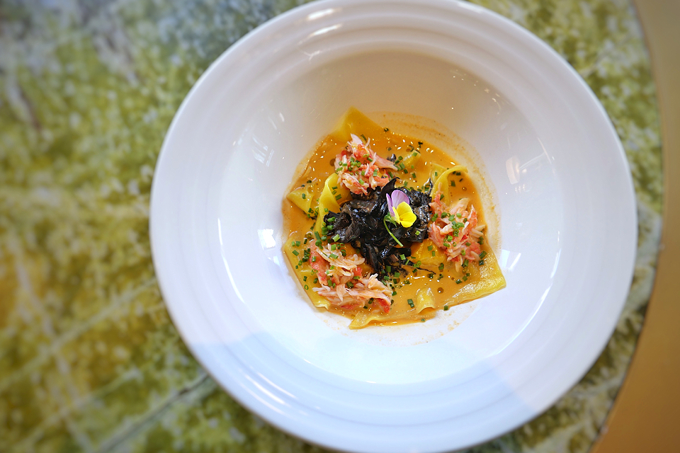 Дальше — фантазии на тему «что там могло бы быть дальше, но они нам этого не показали». Равиоли со смесью краба и креветок внутри и крабом снаружи в соусе из биска и с черными лисичками (которые вдруг оказываются приятно пряными). Гребешок сен-жак (отличный) с пореем ( которому полагалось бы быть гораздо мягче). Мадлен с вишней и фисташковым соусом ел впопыхах, в целом хорошо, но не мешало бы добавить немного толченых фисташек.